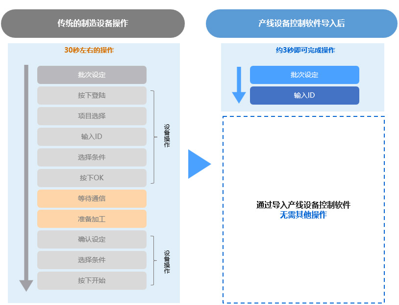 工廠需要將一批待加工材料裝入制造設備,正常的操作流程為設定產品批次、選擇加工時間和其他設定等合計需要大概30秒左右的時間,操作人員需要一直等待在操作臺邊。導入產線設備控制軟件后,只需完成特定的數步操作,其余操作均由機器人執行,合計操作時間縮短至3秒左右。