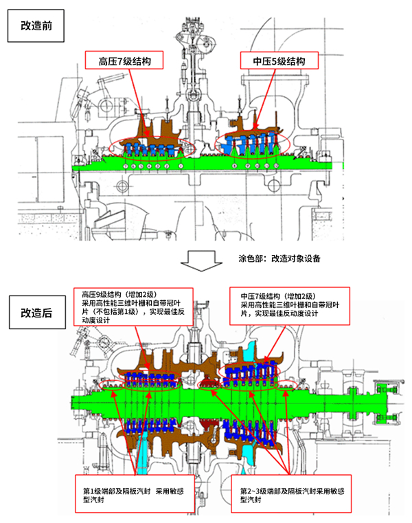 ● 優化各級蒸汽流通方向的變化,并將級數優化從而提高汽輪機效率。