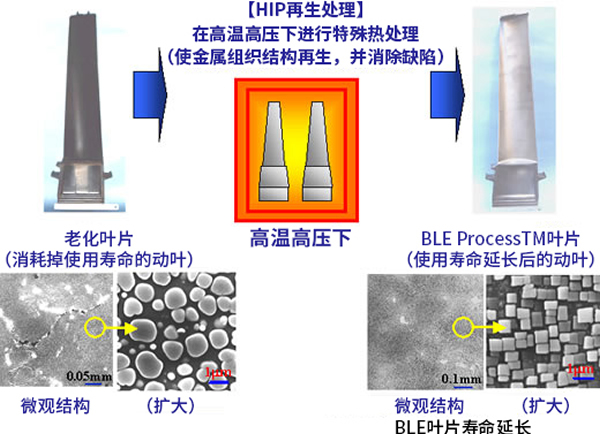 東芝對燃氣輪機的老化和使用壽命問題進行HIP再生處理,使葉片的材料組織結構和強度恢復到與新葉片同等的水平。HIP再生處理是在高溫高壓下通過特殊熱處理使金屬組織結構再生,并消除缺陷的技術。通過HIP再生處理,能夠大幅度地延長造價昂貴的高溫零部件的使用壽命,從而降低維護成本。