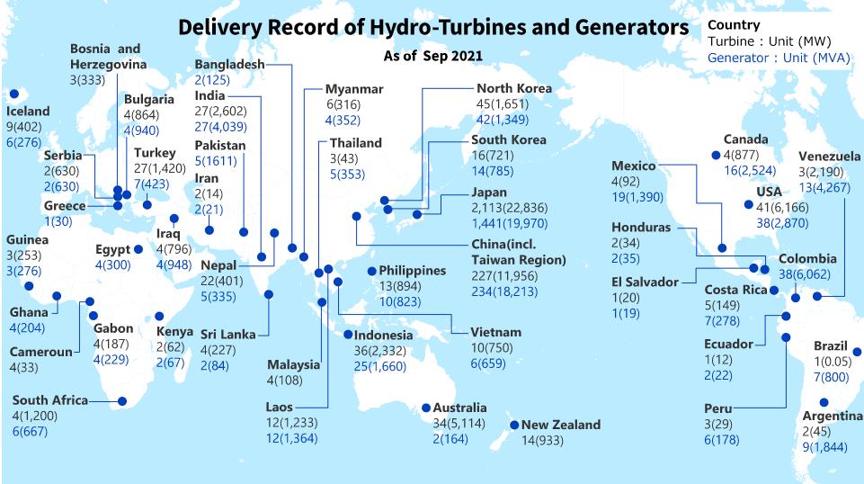 東芝在日本、中國、東南亞乃至非洲及中南美洲共40多個國家和地區累計交付2300多臺水輪機和1800多臺發電機,設備容量分別超過62,000MW和75,000MVA。東芝擁有超過一個世紀的豐富經驗與傲人業績。