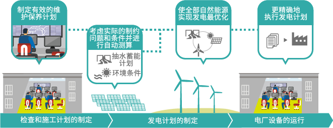 通過統(tǒng)一管理多個(gè)自然能源和抽水蓄能電站的發(fā)電計(jì)劃,在平衡自然能源對電力系統(tǒng)的影響的同時(shí),提高發(fā)電的業(yè)務(wù)的收益。 綜合考量影響自然能源的環(huán)境條件和電力需求的增減等外部情況,電廠的設(shè)備設(shè)施等內(nèi)部情況以及發(fā)電成本等,自動(dòng)為多個(gè)電廠的運(yùn)營和維護(hù)同時(shí)制定計(jì)劃并進(jìn)行管理。