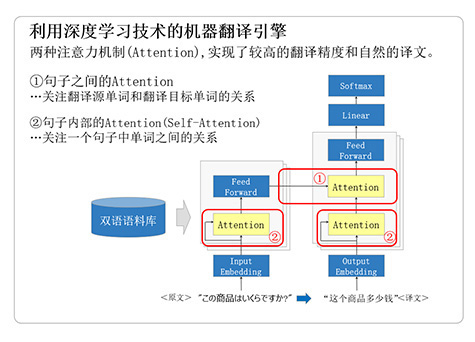 ● 通過基于注意力機制(Attention)的網絡結構和離線大規模雙語語料庫的學習,中日英3種語言6個翻譯方向,中日/日中翻譯達到世界較高水平