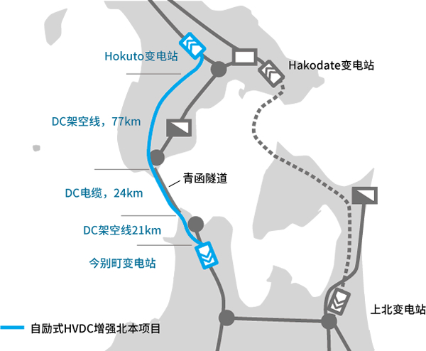 本技術適用于連接日本北海道 — 本州的自勵式直流送電項目(300MW、DC 250kV、DC 1200A)。