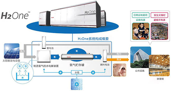 “H2One” 是一個(gè)由太陽能發(fā)電設(shè)備、蓄電池、電解水制氫裝置、儲(chǔ)氫罐、燃料電池等組合而成的自給型能源供應(yīng)系統(tǒng),利用太陽能發(fā)電設(shè)備產(chǎn)生的電能將水電解,制成氫氣儲(chǔ)存于儲(chǔ)氫罐中作為燃料電池的燃料,并通過燃料電池提供電力和熱水。因“H2One”系統(tǒng)只需要陽光和水即能運(yùn)轉(zhuǎn),在發(fā)生災(zāi)害甚至是生命線被切斷的時(shí)刻,該系統(tǒng)也可獨(dú)立提供電力和熱水。川崎MARIEN作為指定的周邊居民災(zāi)害臨時(shí)避難所,一旦發(fā)生災(zāi)害,其所儲(chǔ)存的氫氣可為300人提供約1周左右的電力和熱水。另外,由于“H2One”系統(tǒng)采用了集裝箱式外形,必要時(shí)可以用拖車將該系統(tǒng)運(yùn)往受災(zāi)地區(qū)。