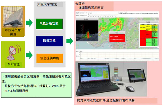 在本次實證實驗中,研究人員將使用能夠在30秒內對導致突發(fā)性暴雨的積雨云形成過程進行立體觀測的相控陣氣象雷達和能夠精確觀測降雨量的MP雷達(注2),通過對二者數(shù)據(jù)的分析,提前預警突發(fā)性暴雨。并將結果以電子郵件的形式報告到大阪府防汛部門以及在各相關站點設置的系統(tǒng),并通過報警燈發(fā)出預警。本系統(tǒng)將在大阪府內的10個站點運行,以驗證預防洪澇災害的有效性。