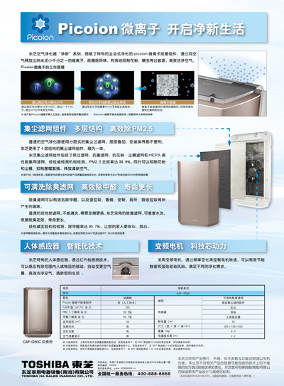 原裝進口的東芝空氣凈化器“凈新”系列CAF-G50C機型,于2013年12月份在中國市場上市,為潔凈空氣助力!目前東芝正聯合京東商城啟動首發促銷活動,好評曬單還可獲大獎,詳情請登陸http://item.jd.com/1010444.html。