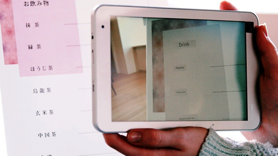 除了語音識別、交互、翻譯等功能,東芝還開發了將可視文字信息即時翻譯成其他語言的技術。想象一下,人們出國旅行,來到一家以美味著稱的餐館,卻往往被菜單上的異國文字搞得一頭霧水,如果菜單上又沒有圖片,根本不知道該如何點菜,而東芝的“RECAIUS™”可幫你擺脫這個困境,拿起智能手機對準菜單進行拍攝,東芝“RECAIUS™”可以瞬間把菜品翻譯成母語,讓你輕松點菜。