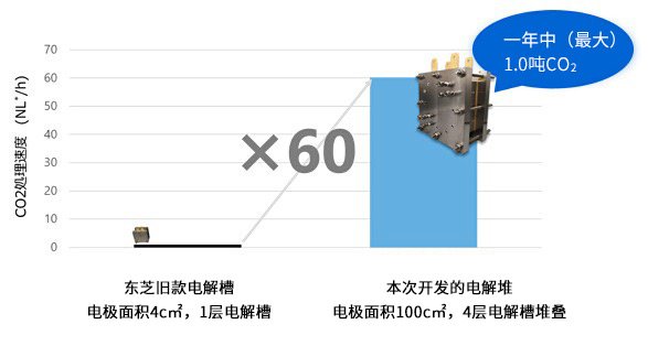 雖然電解組件的堆疊會導致處理速度降低,但東芝通過自身專有技術成功解決了堆疊導致的降速問題。通過堆疊設計提升了單位面積的處理量,在節約空間的同時,可大幅提升CO?轉換設備的實用性。以一個每天排放200噸CO?的垃圾焚燒廠*1為例,根據估算,安裝約2000㎡(相當于5個籃球場大小)的電解堆就可完成全部CO?的處理。通過將電解組件進行堆疊,能夠進一步擴大處理規模,這有助于該設備盡早實現實用化。