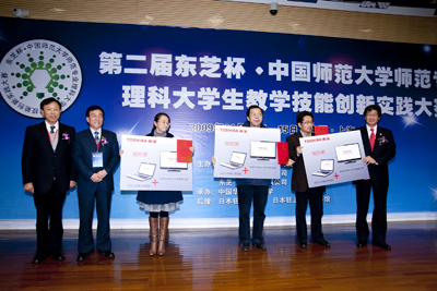 11月14日,15日,由東芝(中國(guó))有限公司、中國(guó)教育部國(guó)際合作與交流司以及師范教育司共同舉辦的 “第二屆 東芝杯?中國(guó)師范大學(xué)師范專(zhuān)業(yè)理科大學(xué)生教學(xué)技能創(chuàng)新實(shí)踐大賽”(以下簡(jiǎn)稱(chēng)大賽)決賽在華東師范大學(xué)舉行。本大賽面向師范大學(xué)學(xué)生,旨在使即將走上工作崗位的師范大學(xué)理科專(zhuān)業(yè)的四年級(jí)學(xué)生能夠成為優(yōu)秀的理科教師,從而為中國(guó)科學(xué)的自主創(chuàng)新發(fā)揮作用。自去年在京舉辦第一屆以來(lái),該大賽受到了社會(huì)的高度關(guān)注,也成為東芝公司在中國(guó)的CSR活動(dòng)的一個(gè)重要部分。