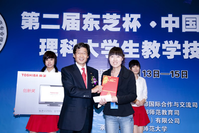 本次教學(xué)技能大賽分預(yù)賽和決賽兩個(gè)階段進(jìn)行,參賽學(xué)生首先在各自所在的院校通過(guò)預(yù)賽選出決賽選手。決賽內(nèi)容包括教案評(píng)比、模擬授課、即席講演三個(gè)部分,由教育部及各院校專(zhuān)家組成評(píng)選委員會(huì)進(jìn)行專(zhuān)業(yè)評(píng)選。即席講演部分采用了現(xiàn)場(chǎng)抽題的方式,極大地考驗(yàn)了參賽同學(xué)的臨場(chǎng)應(yīng)變能力與思維邏輯能力。此外,數(shù)學(xué)、物理、化學(xué)三個(gè)專(zhuān)業(yè)共計(jì)9名獲獎(jiǎng)大學(xué)生還將獲得東芝提供的獎(jiǎng)品以及赴日本研修的機(jī)會(huì)。