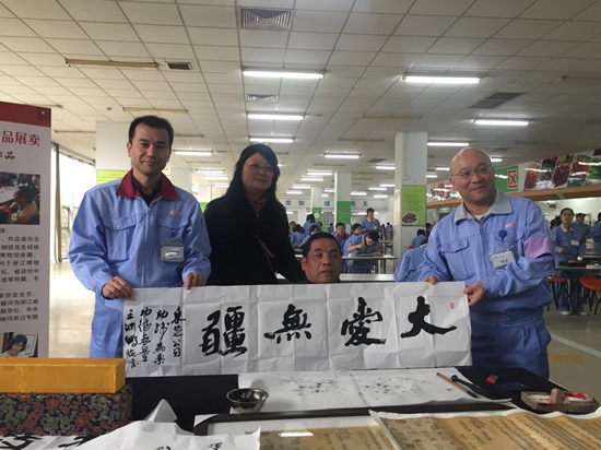 【圖:殘疾人藝術家王淵鵬老師親筆題寫“大愛無疆”贈予東芝杭州地區分公司】