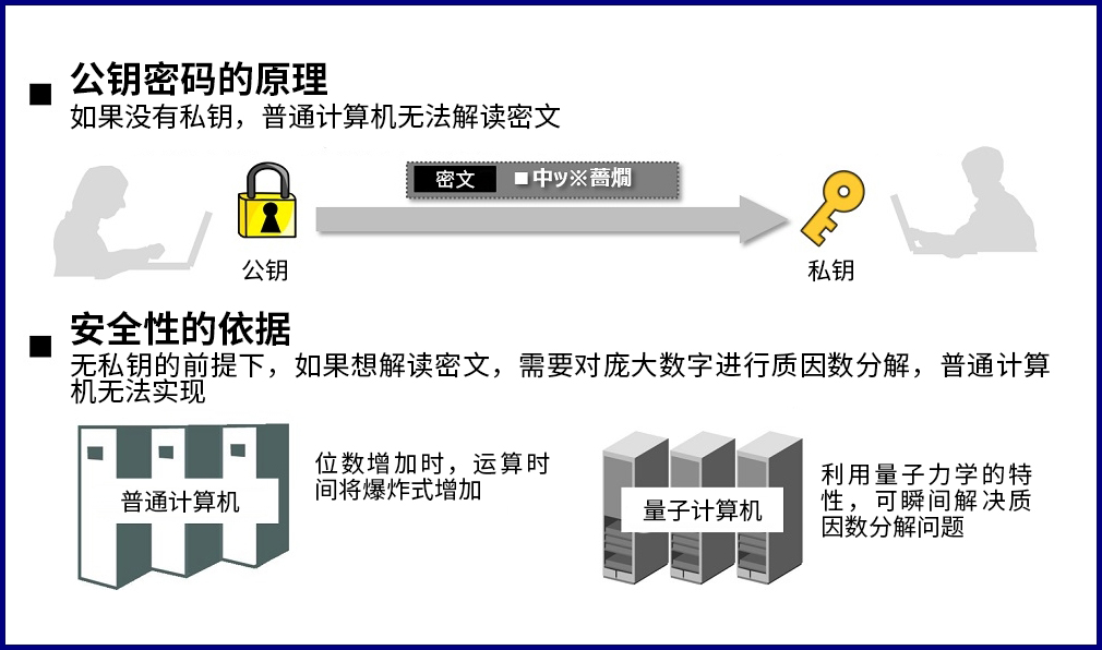 但是,量子計算機的強大處理能力也是一把雙刃劍。未來,我們在享受其帶來的便捷生活的同時,也將面臨各種始料未及的風險。最直接的后果就是:保障當前通信安全的傳統(tǒng)密碼,例如“RSA密碼”1,很可能在短時間內被輕易破解。