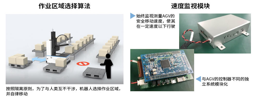 針對此問題,東芝采用“作業區域選擇算法”,為了實現與人類互不干涉的要求,開發出了讓機器能夠選擇作業區域并自律移動的系統,從而確保了人類的安全。此外,與AGV(無人搬運車)控制動作的控制器不同,東芝配備了獨立的速度監視模塊,能夠始終進行客觀的監視,判斷“是否在一定速度之下行駛”,以確保安全。