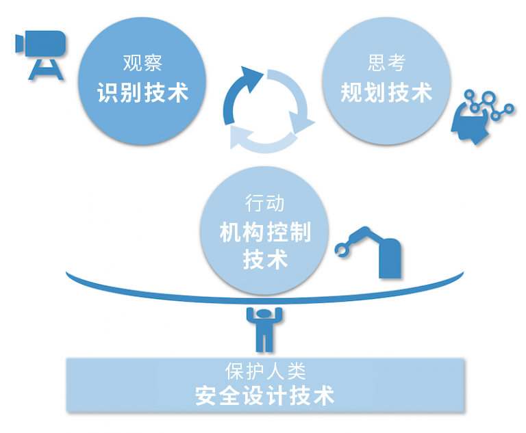 為了讓機器人勝任這種非定型作業,就需要實現機器人智能化,即:觀察、思考、行動。具體而言,“觀察”能力即“識別技術”,“思考”能力即“規劃技術”,“行動”能力即“機構控制技術”。