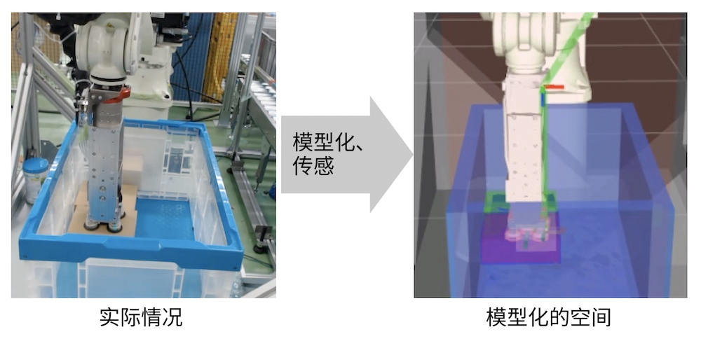 例如,要抓取箱子內的物品時,人類思考的是,想抓取的物品在哪里,大小及重量如何,為避免碰到箱子內側及其他物品又應該如何伸出自己的手臂。