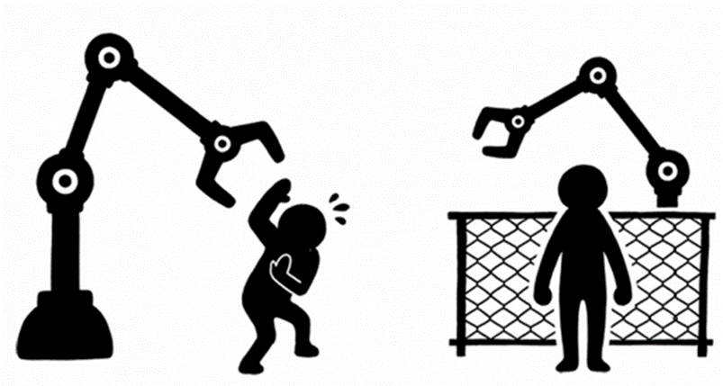 由于人類與機器人的距離變近,出現事故的風險增高。為確保安全性,需要將機器人與人類的作業區域分開,并進行全面管理。