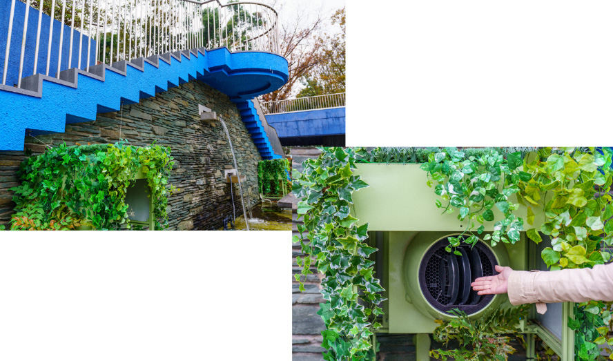 無需天花板管道,安裝自由度大是“FLEXAIR2”的一大特點(diǎn)。在本次實(shí)驗(yàn)中,空調(diào)系統(tǒng)被安裝在了原本是死角的噴泉周圍柱子上。由于送風(fēng)口的輪盤可左右自動(dòng)搖擺,將風(fēng)向外輸送到更大的范圍,所以即便在室外也能保持自然舒適。為了將觀景臺(tái)打造成綠洲,大渕先生在安裝設(shè)計(jì)時(shí)十分注重清涼感、舒適感,目標(biāo)是帶給游客仿佛置身于大自然中的感覺。