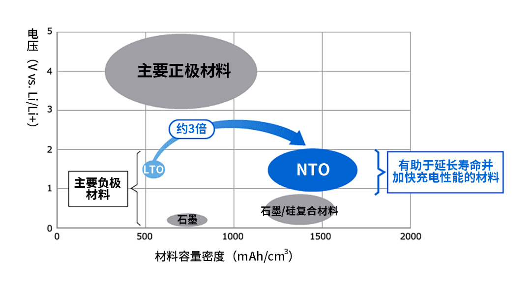 即使SCiB?得到了較好的發(fā)展,東芝也未曾停止對(duì)負(fù)極材料的探索。東芝目前正在研究將鈮鈦基氧化物(NTO)用作下一代負(fù)極材料。在兼具LTO壽命長(zhǎng)和充電快的優(yōu)點(diǎn)同時(shí),NTO的理論容量密度約為L(zhǎng)TO的3倍。