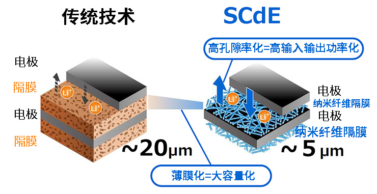 除NTO外,東芝為了推進(jìn)SCiB?的發(fā)展還引進(jìn)了一項(xiàng)新技術(shù)——Skin-Coated Electrode(SCdE)。SCdE是一種新型隔膜結(jié)構(gòu),是指覆蓋在電極材料表面上、由樹脂制成的超薄納米纖維膜,可以分隔陰陽兩極。通常,這種陰正極絕緣的隔膜采用厚度約為20μm的獨(dú)立膜。而東芝采用的是獨(dú)有的電極一體化隔膜,可成功將薄膜厚度減至5μm左右。